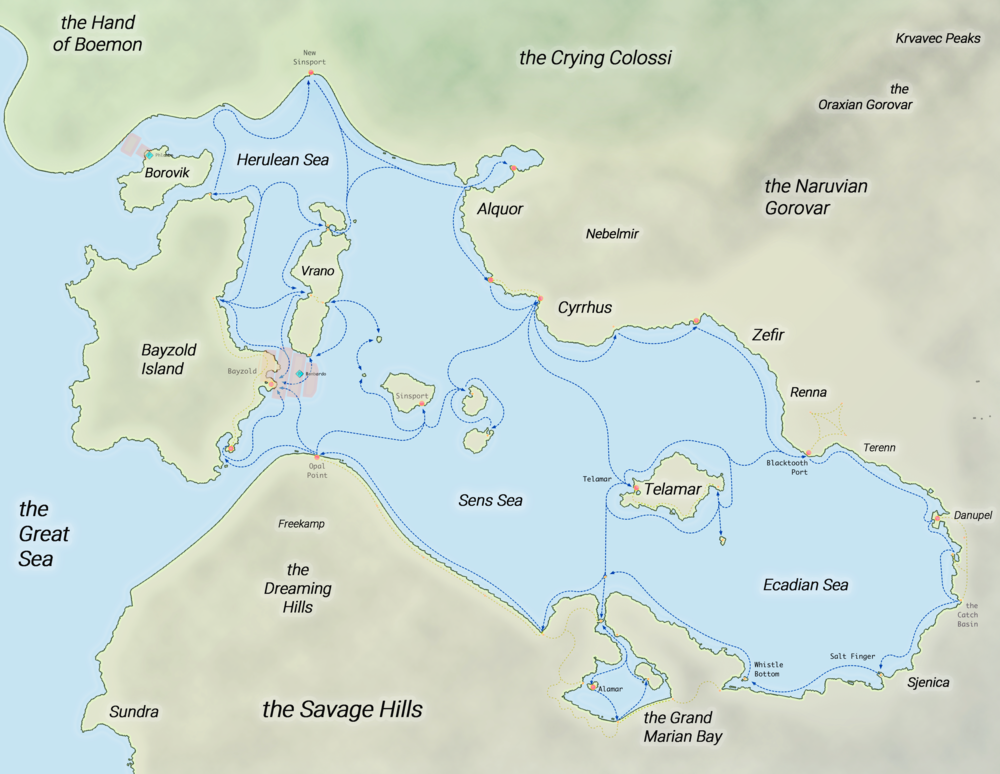 The Dead Gods’ Sea is the dominant feature of the western Tradelands. It is densely populated on the coast, but its interior remains wild. The Dead Gods’ Sea saw greater devastation than any other region during the Godswar, but has rapidly recovered. It is not the second most populous region within the Tradelands, behind Dal Barun.